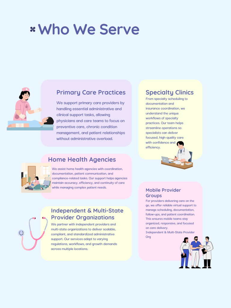 Our team is composed of professionals with healthcare backgrounds, including medical assistants, nurses, and administrative specialists. They bring specialized knowledge and skills that ensure every task—from scheduling to clinical support—is handled accurately and efficiently.